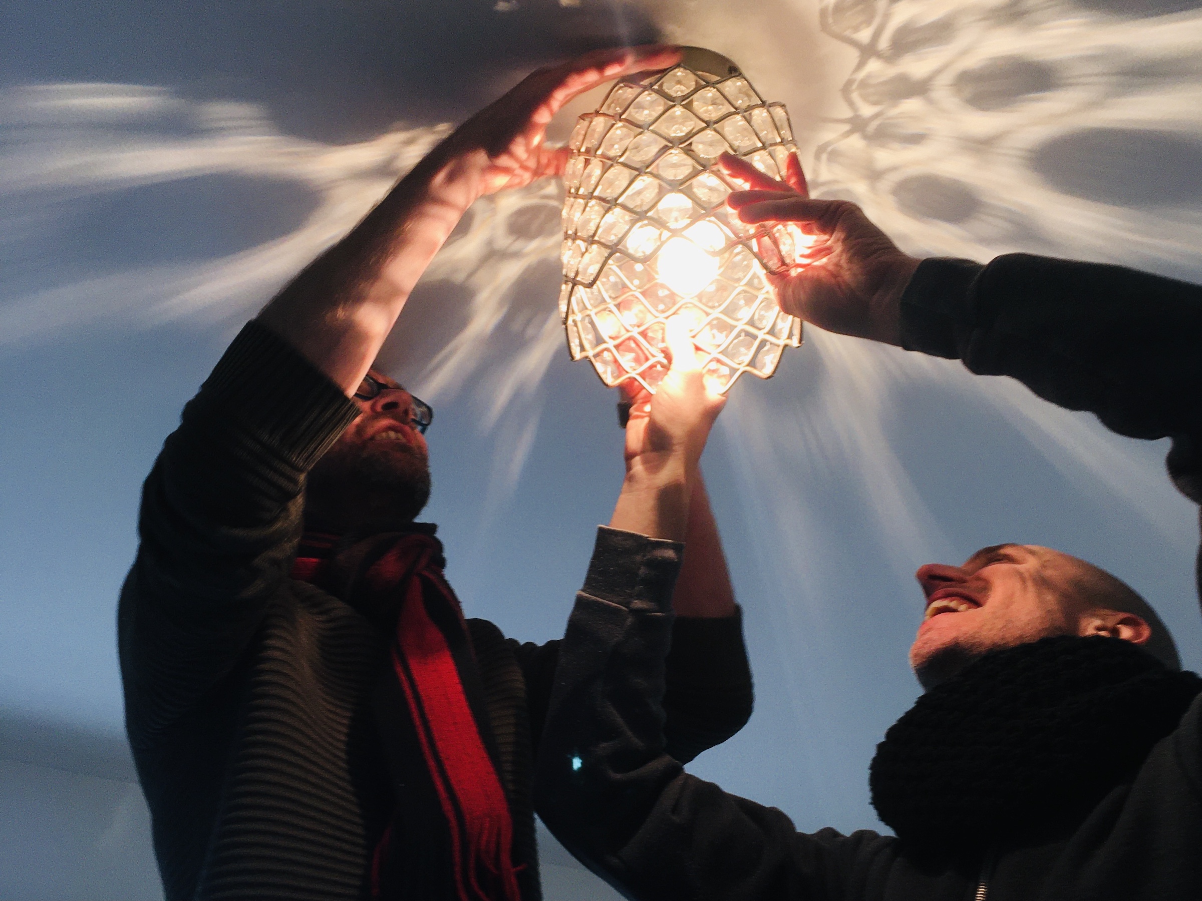 Bright smiles, as the faces of my friends finally become illuminated. Though it is unclear from the photo, mounting this fixture had turned out to be challenging. Shot on our very first day at home in Antwerp.