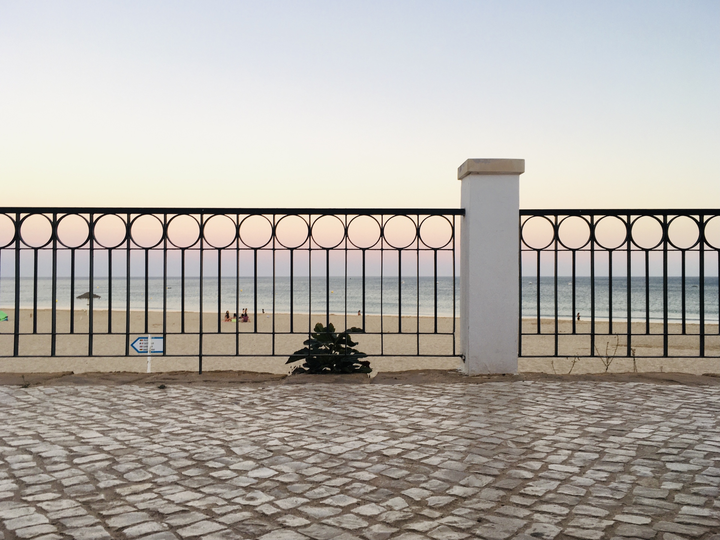 Looking out over the beach from a boardwalk cafe. It had been an incredibly hot day, and by the time of capture temperature had just about become bearable. The town of Luz, Portugal, otherwise packed with people, feels desolate. I shot from the hip but never quite captured what I intended to.