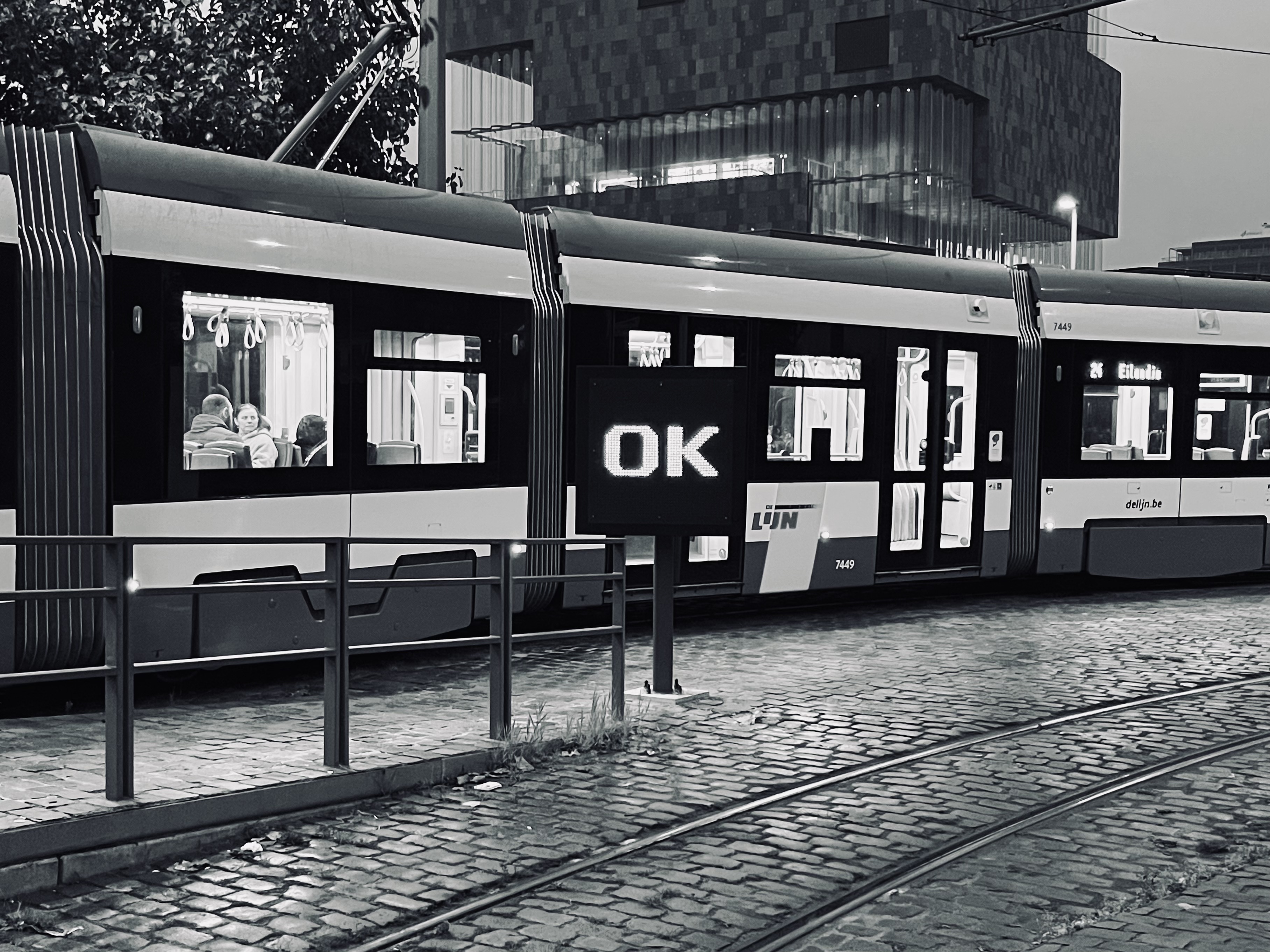 A bright OK sign lights up, unnecessary yet reassuring, as a tram slowly but finally starts moving. Public transport had been in gridlock for hours on a rainy autumn day.